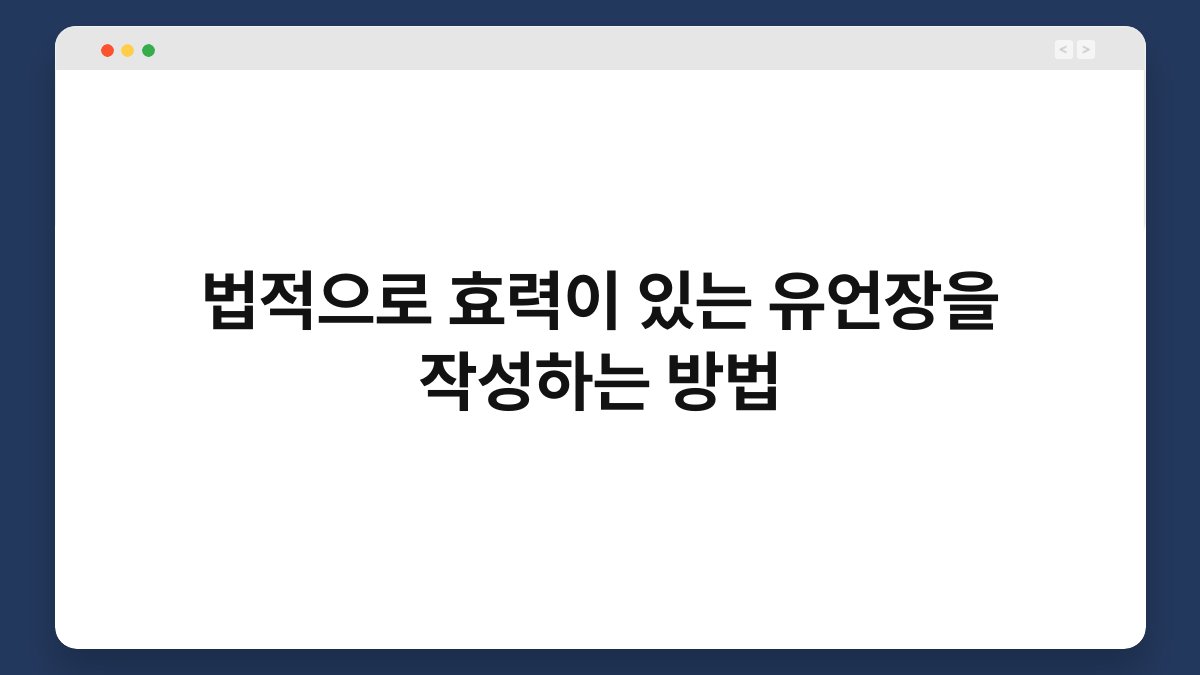 유언장은 사랑하는 사람에게 남기는 마지막 메시지입니다. 하지만 많은 사람들이 법적으로 효력이 있는 유언장을 작성하는 방법에 대해 잘 모르고 있습니다. 유언장이 없다면, 소중한 자산과 의도가 제대로 전달되지 않을 수 있습니다. 그러므로 이번 글에서는 법적으로 효력이 있는 유언장을 작성하는 방법을 단계별로 안내해드리겠습니다....