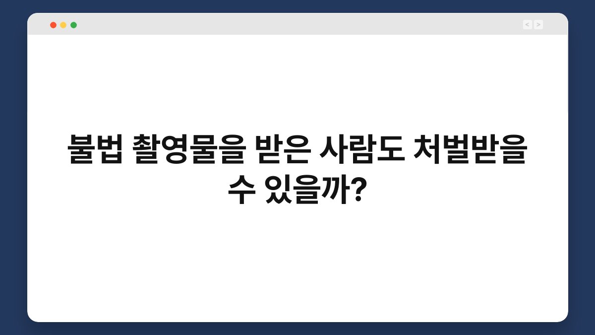 불법 촬영물에 대한 사회적 관심이 높아지고 있습니다. 이와 함께, 불법 촬영물을 받은 사람도 처벌받을 수 있는지에 대한 궁금증이 커지고 있죠. 많은 이들이 "그냥 받은 것인데 왜 나까지?"라는 생각을 할 수 있습니다. 하지만 법적 책임은 단순히 촬영한 사람에게만 국한되지 않습니다. 이번...