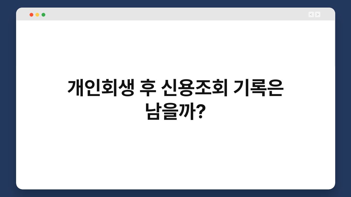 개인회생을 고려하시는 분들이라면 여러 가지 궁금증이 생기기 마련입니다. 특히, 개인회생 후 신용조회 기록이 어떻게 남는지에 대한 질문은 많은 분들이 공감할 수 있는 부분입니다. 개인회생이 끝난 후에도 신용 기록이 남는다면, 다시 신용을 쌓는 데에 어떤 영향을 미칠지 걱정이 되실 테니까요. 이번...