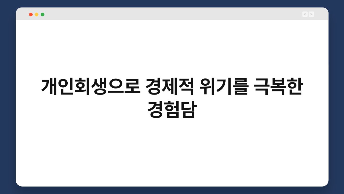 개인회생으로 경제적 위기를 극복한 경험담 2025-10-07 작성자: 지식전문 블로거 경제적 위기를 겪는 것은 많은 이들에게 힘든 경험입니다. 특히 예상치 못한 상황에서 재정적 압박을 받게 되면, 어떻게 대처해야 할지 막막해지기 마련이죠. 이런 상황에서 '개인회생'이라는 제도가 큰 도움이 될 수 있습니다. 오늘은 개인회생을 통해 경제적 위기를 극복한 경험담을 나누며, 이 제도가...