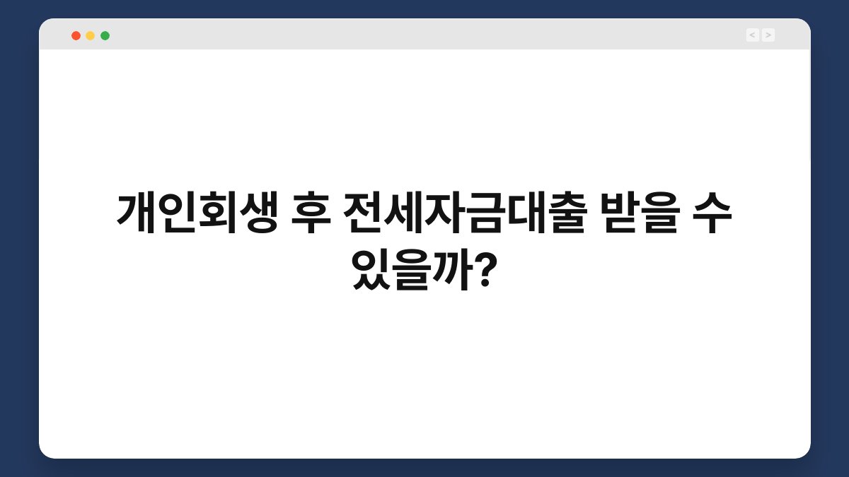 개인회생을 경험한 후, 전세자금대출을 받을 수 있을지 궁금하신가요? 많은 분들이 개인회생 이후 경제적 재건을 위해 다양한 방법을 모색하고 있습니다. 그 중 하나가 바로 전세자금대출입니다. 과연 개인회생 후에도 전세자금대출이 가능할까요? 이 글에서는 그에 대한 자세한 정보를 제공해 드리겠습니다. 함께 살펴보시죠!