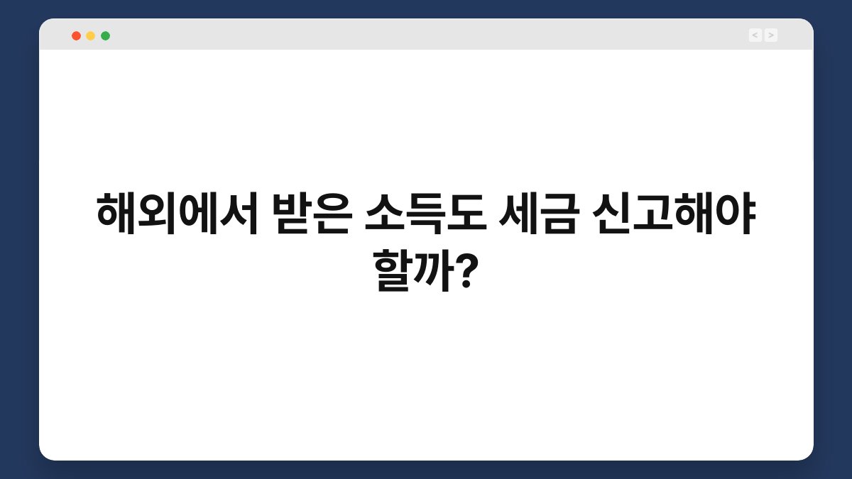 해외에서 받은 소득도 세금 신고해야 할까? 2025-10-25 작성자: 지식전문 블로거 해외에서 소득을 얻는 일, 정말 멋진 경험이죠? 하지만 그만큼 세금 문제에 대한 고민도 함께 따라옵니다. 많은 분들이 "해외에서 받은 소득도 세금 신고해야 할까?"라는 질문을 던지곤 합니다. 이 글에서는 이 질문에 대한 명쾌한 답변과 함께, 해외 소득 신고의 중요성을 짚어보겠습니다. 세금...
