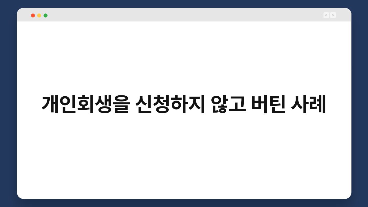 어떤 일이든지 어려운 상황을 맞닥뜨리면 대처 방법을 고민하게 됩니다. 특히 재정적인 문제는 많은 사람에게 큰 스트레스가 되죠. 개인회생을 신청하지 않고도 어려움을 극복한 사례들이 있습니다. 이 글에서는 이러한 사례들을 통해 어떤 방법으로 어려운 상황을 이겨낼 수 있는지 알아보겠습니다. 여러분의 상황에 맞는...