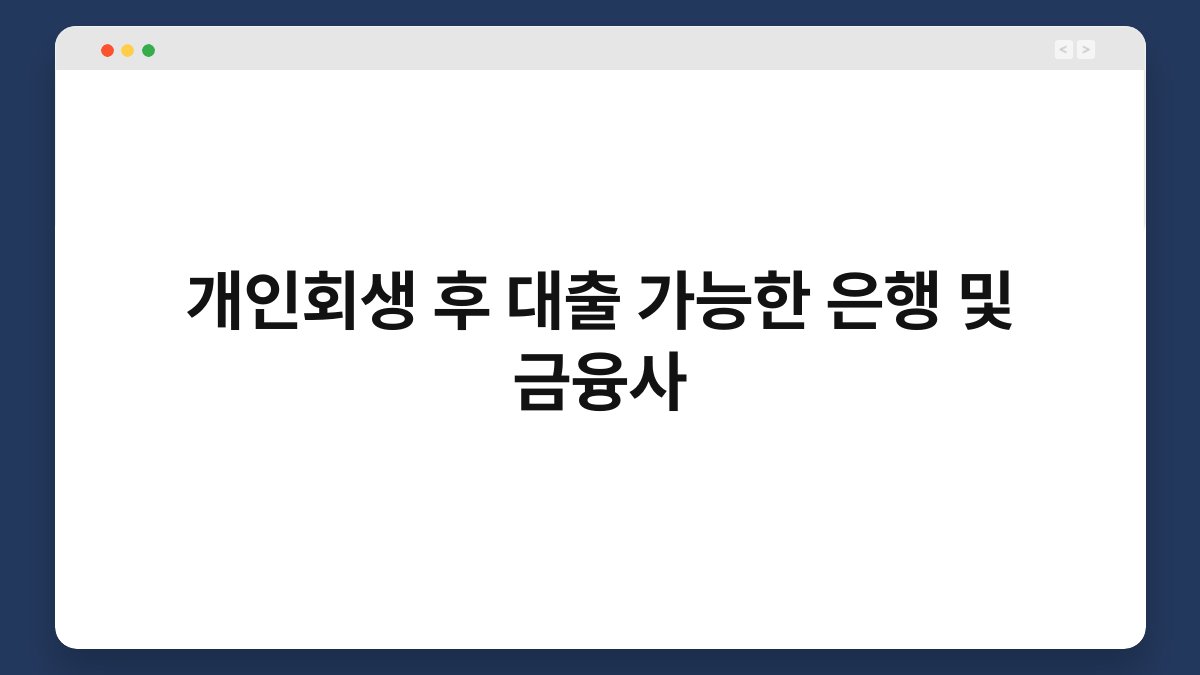 개인회생 후 대출 가능한 은행 및 금융사 2025-10-29 작성자: 지식전문 블로거 개인회생을 통해 새로운 시작을 꿈꾸시는 분들이 많습니다. 하지만 회생 절차를 마친 후 대출이 가능할지 고민하는 분들도 적지 않죠. 개인회생 후에도 대출이 가능한 은행과 금융사를 알아두면, 필요한 자금을 보다 쉽게 마련할 수 있습니다. 이 글에서는 개인회생 후 대출이 가능한 금융사들에 대한...